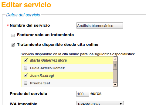 Para poder configurar adecuadamente los servicios que estarán disponibles para cada profesional, en la pantalla «Servicios», elegiremos el servicio que queramos hacer público, lo editaremos y marcaremos la casilla «Tratamiento disponible desde cita online«. Ahora debajo de esta casilla aparece un listado con todos los especialistas que tenemos en la clínica. Solo tenemos que elegir qué especialistas pueden encargarse de ese servicio y pinchar en Guardar.